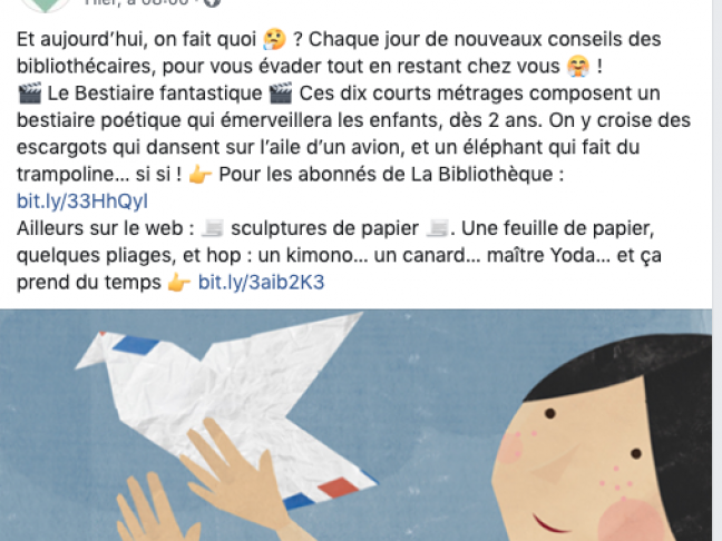 Pour faire découvrir cette offre foisonnante aux usagers, les professionnels redoublent d’inventivité et proposent de nouvelles actions de médiation - ou tout du moins, des actions de médiation renouvelées par l’utilisation de nouveaux outils : heures du conte sur Youtube, création d’un compte Twitter spécial #confinement, de blog ou de page de site dédiée à la situation sanitaire.