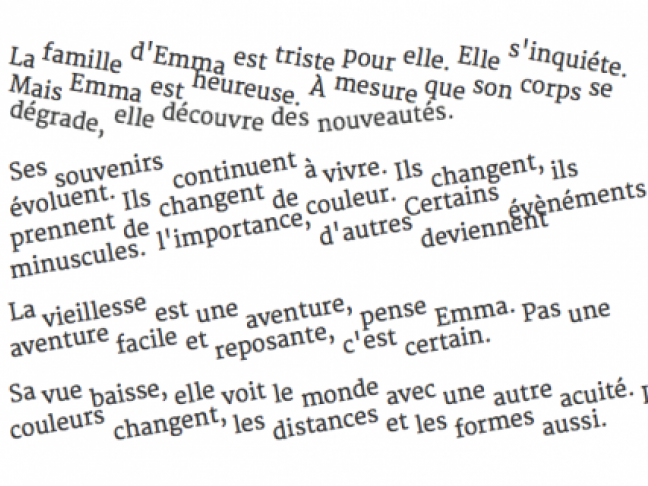Emma, le personnage du récit, est une vieille dame touchée par les difficultés de l’âge. Mais au lieu d’y voir une tragédie, elle se met dans l’idée d’apprendre à utiliser sa vieillesse. « Nous avons travaillé dans un va-et-vient constant. J’ébauchais par écrit quelques scènes, puis Samuel concevait leur animation qui amenait parfois à modifier le texte... »