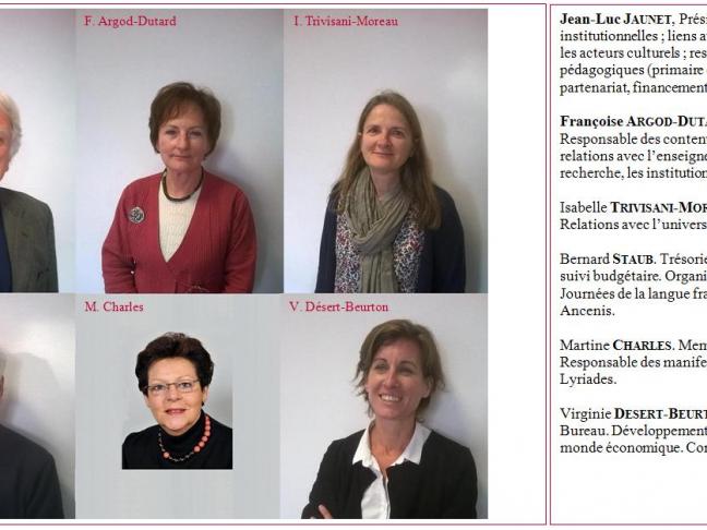 Pour l’accompagner dans ses missions, le nouveau président a constitué une équipe resserrée : le rôle de chaque membre a été redéfini précisément pour entrer dans l’action. Le bureau est à présent composé d’une directrice scientifique, d’une secrétaire, d’un trésorier qui sera aussi référent pour l’organisation des manifestations littéraires, d’une responsable des événements culturels et, enfin, d’une responsable des relations avec les entreprises. Le nouveau président se réserve le volet pédagogique des Lyriades, les relations institutionnelles, les recherches de mécénat et le développement des partenariats.
