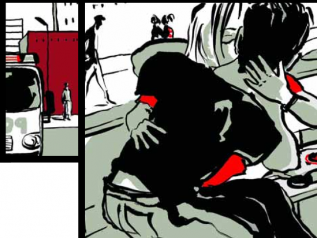 Zaü travaille au pinceau, ainsi son trait donne des images expressives, adoucies par la souplesse de son geste. Plutôt descriptive, elles s’attachent à nous montrer les portraits des personnages et des lieux et forment comme un storyboard. Ce choix de déployer ses cases sur tout l’espace de la double page dans des format divers dynamise le propos: carrés, hauteurs, largeurs, petites vignettes alternent les points de vue, donnent du rythme. Dans ce montage de leur ouvrage, les auteurs convoquent le cinéma tout autant que le théâtre.