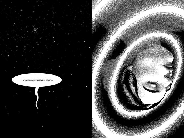 Rares sont les livres où l’on revient en arrière pour admirer, à nouveau, les pages à peine tournées. Bezimena, est de ceux là. Et la puissance du dessin ne doit pas nous faire oublier la force de l’histoire. Le parti pris graphique de la narration s’établit d’emblée. Page de gauche le texte. Page de droite le dessin. Un seul dessin pleine page. Et pour ce qui est du rare texte, un ou deux phylactères blancs (trois au plus) sur un noir de ciel étoilé.
