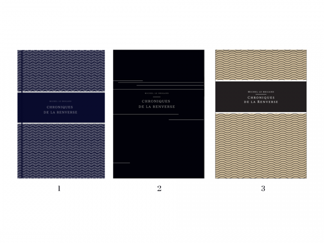 La couverture du livre a beaucoup évolué au cours de ce projet et a connu trois visuels différents. Pour les trois propositions, l'idée était à chaque fois de garder un aspect linéaire avec des motifs rappelant le mouvement de l'eau ou encore la ligne d'horizon. Les suggestions de couleurs sont passées du bleu au noir, pour finalement adopter une couleur café (sans doute plus fidèle à celle de la Loire...).