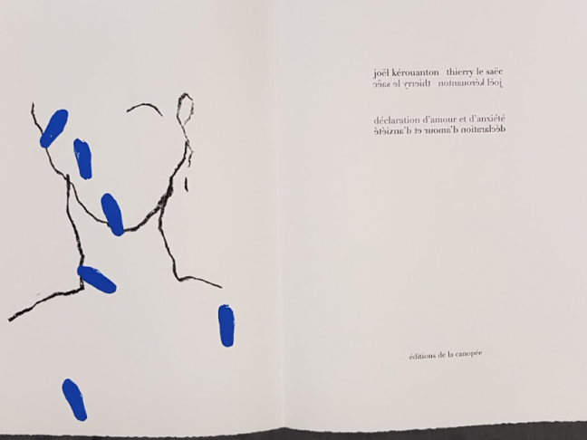 Ce poème/récit inédit de Joël Kérouanton a été composé en didot de corps douze et enrichi de dix bois gravés, dont deux rehaussés à la gouache et d’un dessin de Thierry Le Saëc. Ce livre d'artiste, petit bijou éditorial, est consultable dans les locaux de Mobilis pendant encore quelques jours, profitez-en !