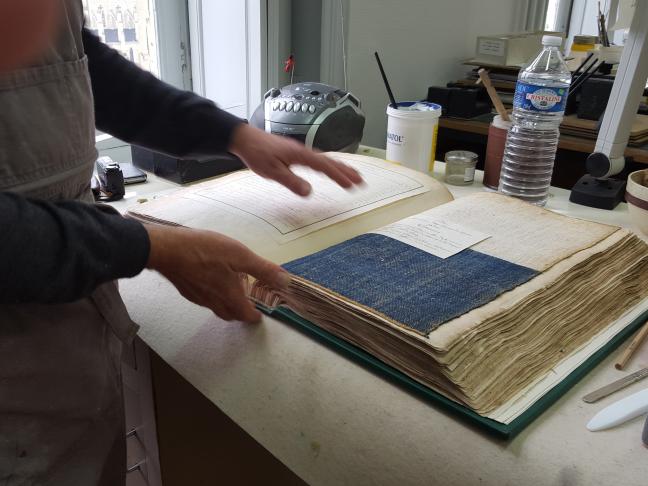 Armé d’un ensemble d’outils performants pour la conservation et la restauration de documents très divers qui couvrent le dernier millénaire, le centre Joël-Le Theule a développé deux savoir-faire spécifiques. Tout d’abord le traitement des très grands formats. « Quand vous devez manipuler pour le restaurer un document qui fait trente kilos, ce n’est pas pareil qu’un petit livre. Il faut travailler à deux », explique Annie Bonnaud. Cette capacité à traiter les très grands formats est évidemment liée au parc des machines que possède le centre, mais aussi à l’espace offert par le château de Sablé-sur-Sarthe.