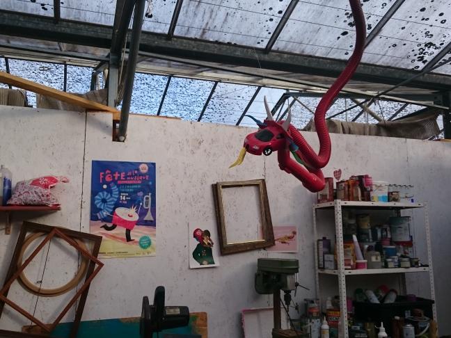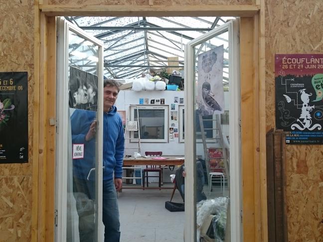 Mon atelier est installé au milieu d’autres ateliers d’artistes et d’artisans sous d’anciennes serres, en pleine campagne. Nous sommes assez nombreux, environ une vingtaine actuellement ─ et d’autres à venir ─, il y a même un garage ! J’y suis à la fois seul dans ma bulle et avec les autres. J’ai un atelier suffisamment grand pour avoir toute ma « nourriture » sous les yeux. Quand je suis ici, je travaille à 100 %. Le téléphone capte mal. Notre réseau téléphonique est mauvais et nous sommes isolés, ce qui n’est pas plus mal ! C’est aussi un lieu plein d’émulation. Avant j’étais seul chez moi, ou et plutôt solitaire, maintenant quand je bloque, je vais discuter avec mes « voisins », ça me permet de faire décanter les choses et de repartir. Il y a toujours quelqu’un pour partager ses compétences avec vous, et vous rendre encore plus efficace dans votre travail. Nous avons un lieu festif avec une scène où nous organisons régulièrement des soirées : concerts, spectacles. C’est un test pour ceux qui l’offrent aux autres, c’est un bon fonctionnement. Tout le monde se nourrit des autres mais a son propre espace propre.