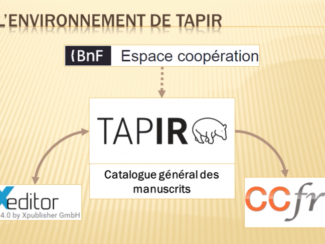 Après un panorama rapide sur le signalement des manuscrits des bibliothèques françaises, cette vidéo vous permet de découvrir les liens existant entre TapIR, le Catalogue général des manuscrits (CGM) et le Catalogue Collectif de France (CCFr).