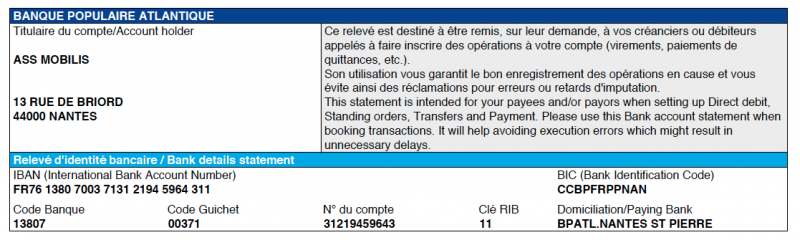 - soit vous remplissez le formulaire ci-dessous et vous envoyez votre règlement par chèque ou par virement : le RIB de Mobilis