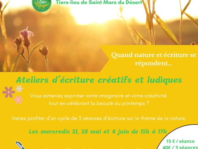 Une nouvelle collaboration avec le Tiers-Lieu de Saint Mars du Désert pour un cycle de 3 ateliers d"écriture très nature , au programme :