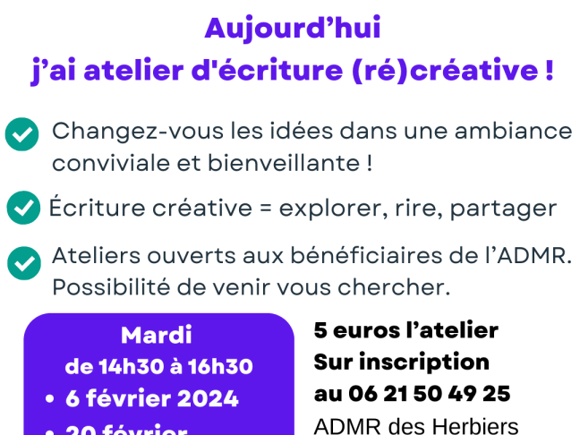 Vous êtes le/la bienvenu(e) aux ateliers d’écriture (ré)créatives ouverts aux bénéficiaires de l’ADMR des communes du Pays des Herbiers.