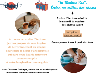 S'initier à l'écriture de la nouvelle 11/10/2025 Venez vous initier à l'écriture de la nouvelle dans le cadre chaleureux du café associatif le Chapati ! Lire la suite Type d'événement Atelier d'écriture