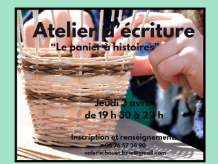 Vannerie et écriture – Le panier à histoires 03/04/2025 Dans une 𝐚𝐦𝐛𝐢𝐚𝐧𝐜𝐞 𝐜𝐨𝐧𝐯𝐢𝐯𝐢𝐚𝐥𝐞, nous explorerons le vocabulaire riche de cet artisanat, jouerons avec les mots comme on joue… Lire la suite Type d'événement Atelier d'écriture
