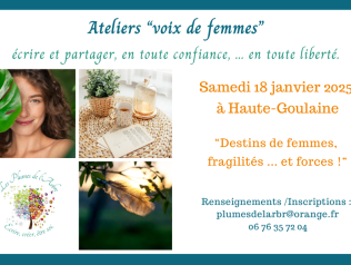 Atelier Ecriture "Destins de femmes, forces et fragilités" 18/01/2025 Les femmes ont longtemps été perçues comme fragiles... Mais admettre ses fragilités est déjà une force. Et qu'en est-il quand… Lire la suite Type d'événement Atelier d'écriture