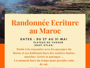 RANDONNEE ECRITURE AU MAROC 27/05/2024 - 31/05/2024 Vous avez envie de dépaysement ? Vous aimez marcher et écrire ? Alors ce séjour est pour vous ! Ce sera où ? L'aventure… Lire la suite Type d'événement Atelier d'écriture