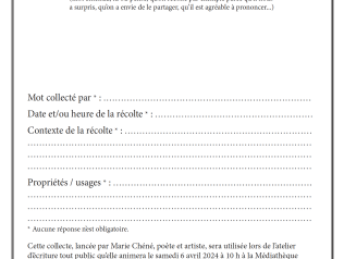L'herbier des mots, atelier d'écriture proposé par Marie Chéné 06/04/2024 Dans le cadre de la résidence l'Esprit du lieu, Marie Chéné propose un atelier d'écriture à partir d'un herbier de mots, à la… Lire la suite Type d'événement Atelier d'écriture