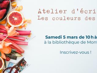 Atelier d'écriture Les couleurs des mots 05/03/2022 Un ateliers d'écriture pour explorer ensemble toutes les nuances qui nous entourent. Des textes pour apprivoiser les couleurs… Lire la suite Type d'événement Atelier d'écriture