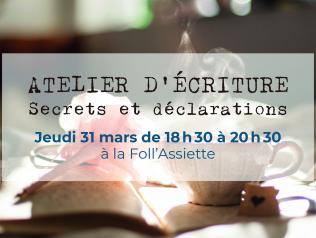 Ateliers d'écriture Secrets et déclarations à La Roche-sur-Yon 31/03/2022 Il y a les choses que l'on dit et les choses que l'on tait. Les choses que l'on cache et les choses que l'on clame. Les mots… Lire la suite Type d'événement Atelier d'écriture