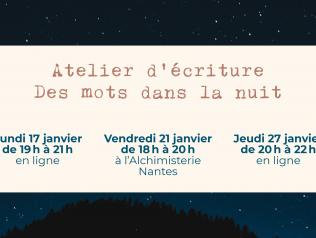 Atelier d'écriture Des mots dans la nuit en ligne 17/01/2022 Dans la nuit, il y a les mots chuchotés, les mots pensés, les mots évités, les mots criés. Il y a les phrases d’amour, de… Lire la suite Type d'événement Atelier d'écriture