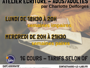 Atelier d'écriture à l'année au café associatif du Labo au Loroux-Bottereau 10/09/2025 Ateliers d'écriture adultes à l'année « Des Mots à Modeler » Vous n'avez jamais participé à un atelier d'écriture et vous… Lire la suite Type d'événement Atelier d'écriture