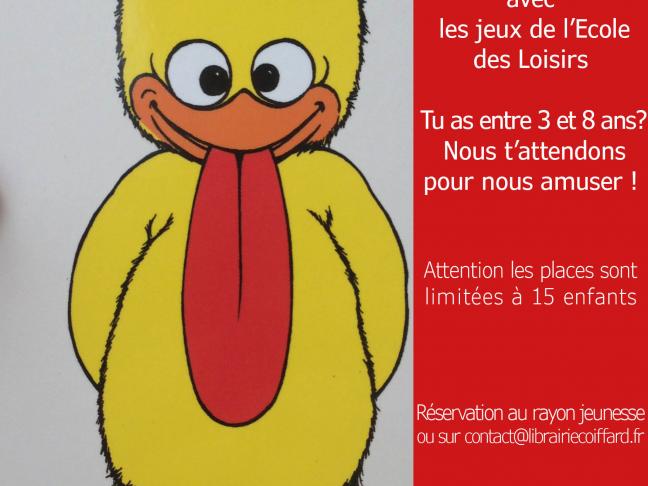 Tu as entre 3 et 8 ans, alors viens jouer avec nous aux jeux de l'École des Loisirs. Haut les pattes ! Pouss'poussins ! Cornebidouille ! Ça te dit quelque chose? Oui ! Ces jeux sont issus des albums de sorcières, de poussins, et de cow boy, de Claude Ponti, de Magali Bonniol, et Pierre Bertrand, et de Catharina Valckx entre autres jeux bien plus nombreux. Loto, puzzle, mémo rigolo, avec les héros de ta bibliothèque.