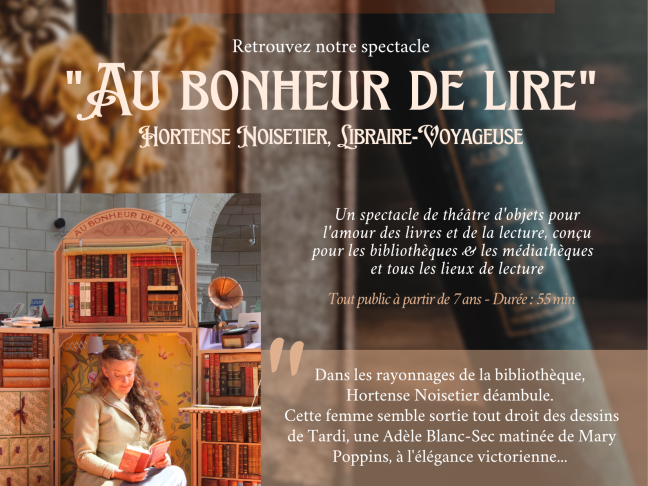 Retrouvez notre spectacle "Au Bonheur de Lire" dans le cadre des Nuits de la Lecture les 19, 20 et 21 janvier 2024. Un spectacle de théâtre d'objets pour l'amour des livres et de la lecture, conçu pour les bibliothèques & les médiathèques et tous les lieux de lecture.