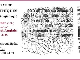 Stage Calligraphie animé par Laurent Pflughaupt 13/09/2017 - 15/09/2017 Etude des lettres gothiques avec Laurent Pflughaupt, au cours d'un stage de 3 jours.. Renseignements et inscriptions… Lire la suite Type d'événement Autre manifestation