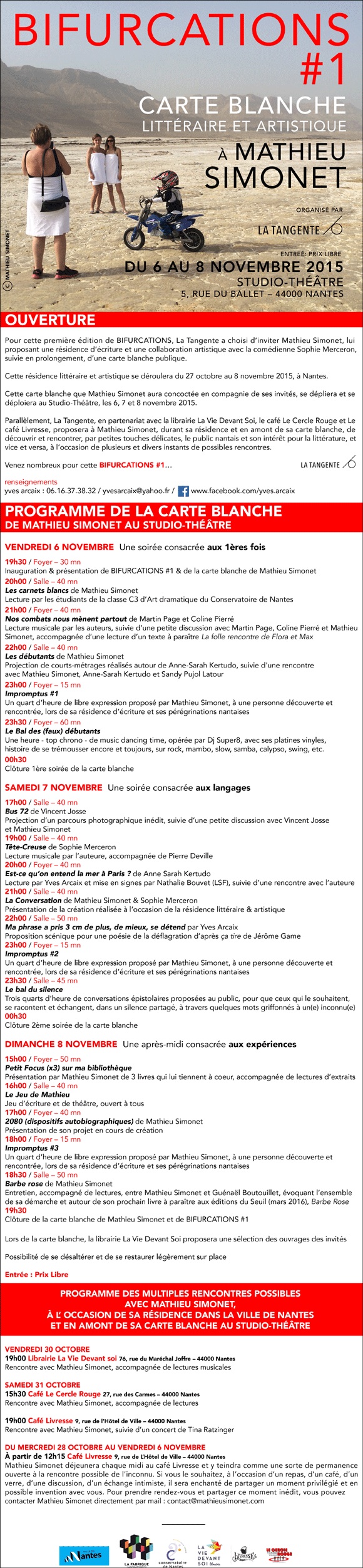 Parallèlement, La Tangente, en partenariat avec la librairie La Vie Devant Soi, le café Le Cercle Rouge et Le café Livresse, proposera à Mathieu Simonet, durant sa résidence et en amont de sa carte blanche, de découvrir et rencontrer, par petites touches délicates, le public nantais et son intérêt pour la littérature, et vice et versa, à l’occasion de plusieurs et divers instants de possibles rencontres.