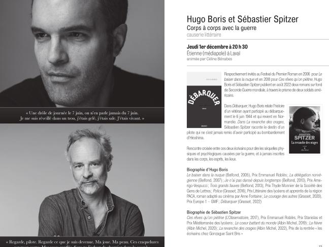 Hugo Boris et Sébastien Spitzer sont deux auteurs labellisés Lecture en Tête, tous deux invités au Festival du Premier Roman et des Littératures Contemporaines pour leur premier roman : le premier fut accueilli en 2006 pour Le baiser dans la nuque (Belfond, 2005), Prix Emmanuel Roblès, le second en 2018 pour Ces rêves qu'on piétine (L'observatoire, 2017), prix Emmanuel Roblès, Prix Stanislas et prix Méditerranée des lycéens.