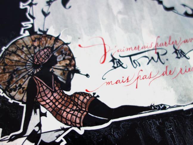Faisons parler la femme ! par une citation emblématique, une tirade bien pensée, un trait d’humour bien placé. Nous travaillerons graphiquement un personnage et son univers que nous mettrons en scène sur un support cartonné et la valoriserons par la calligraphie d’une pensée…