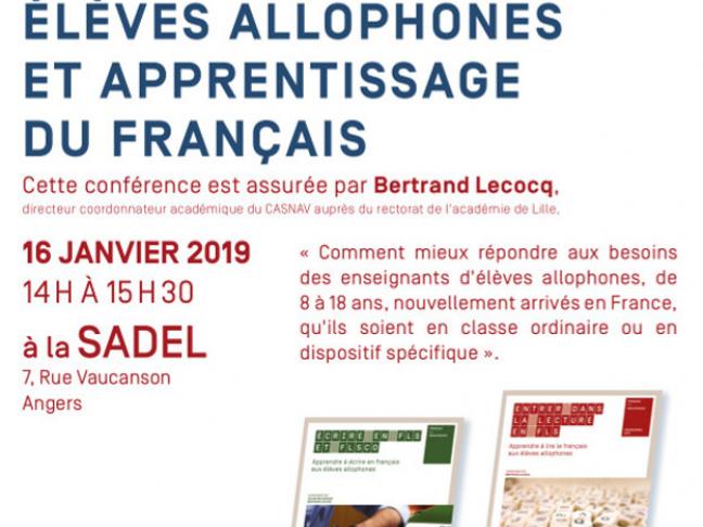 Le mercredi 16 janvier 2019 la Sadel Angers en lien avec le Réseau CANOPE, Réseau de Création et d' Accompagnement Pédagogiques, accueillera Bertrand Lecocq pour une conférence consacrée aux besoins des enseignants d'élèves allophones. Conférence sur réservation au 06 19 12 65 32.