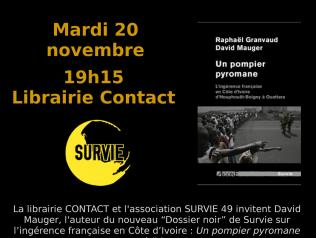 Rencontre avec David Mauger de l'association SURVIE à la librairie Contact 20/11/2018 La librairie CONTACT et l'association SURVIE 49 invitent David Mauger, l'auteur du nouveau “Dossier noir” de Survie sur l… Lire la suite Type d'événement Conférence, débat, forum