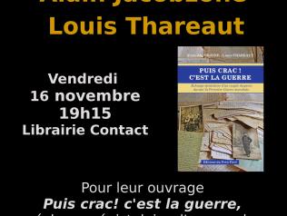 Rencontre avec Alain Jacobzone et Louis Thareaut 16/11/2018 La librairie Contact accueillera le vendredi 16 novembre Alain Jacobzone et Louis Thareaut pour leur ouvrage Puis crac! c'est… Lire la suite Type d'événement Conférence, débat, forum
