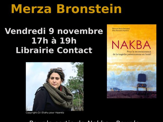La librairie contact accueillera en dédicace le vendredi 9 novembre 2018 de 17h à 19h Eléonore Merza Bronstein pour la sortie de son livre Nakba - Pour la reconnaissance de la tragédie palestinienne en Israël paru aux éditions Omniscience.