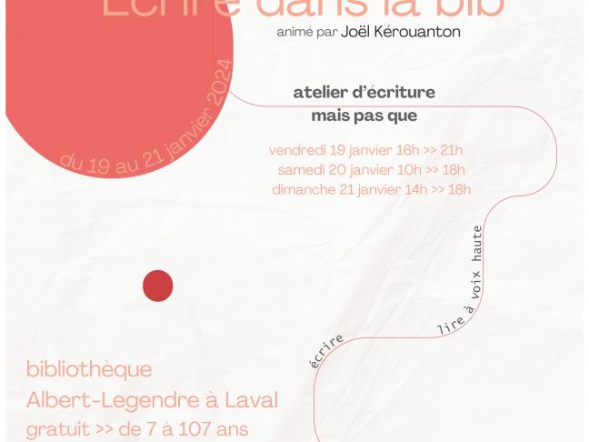 2 jours d'écriture, de réécriture, de lectures et d'impromptus, le tout orchestré par Joël Kérouanton, le vendredi 19 janvier de 16 h à 21 h et le samedi 20 janvier de 10 h à 18 h. Les participants pourront s'installer pendant la durée de leur choix : 20 minutes, 2 heures, 2 jours ! Ces deux jours aboutiront à un moment festif et convivial : une lecture-spectacle pour entendre à voix haute les textes des participants.es par les participants.es eux-mêmes, par des lecteurs.rices, des passants.es, le dimanche 21 janvier à 16 h autour d'un goûter.