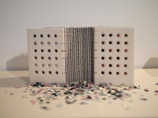 Amélie Doussot a effectué des études à l’Ecole des BeauxArts et à l’Université de Nantes en Histoire de l’Art. Des formations qu’elle a couplées avec une formation en reliure et en restauration de livres anciens. Devenue relieuse, elle aime débrocher les cahiers, grecquer le papier, faire des nœuds de chaînette, cambrer le carton... Toutes ces étapes du travail du papier et du livre ont structuré sa démarche de travail et sa pensée. Pour l’exposition Codex etc !, l’artiste joue avec les codes et la forme du codex qui est l’une des formes du livre la plus ancienne. Elle les détourne et les contourne. Les objets produits sont des formes hybrides entre livres et sculptures qui ouvrent sur un nouvel imaginaire. Chaque livre-objet est autonome et se raconte lui-même dans des formes poétiques et ludiques.