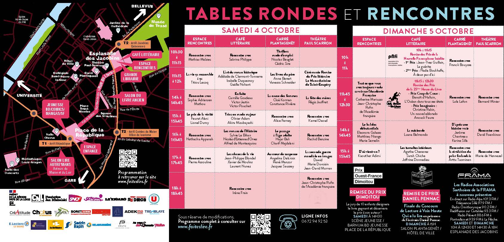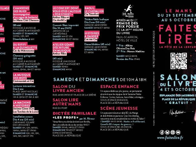 La programmation est extrêmement large et est principalement centrée sur les auteurs de la rentrée littéraire, ce qui inscrit le salon du Mans parmi les incontournables au niveau national. Une notoriété qui s’appuie par la présence d’auteurs primés et un partenariat remarquable avec l’Académie française. Parmi les 160 auteurs attendus : des têtes d’affiches, des premiers romans, des grands auteurs en devenir, des auteurs locaux et avec une diversité des genres représentés (littérature générale, BD, jeunesse, polars, thrillers…) participent à la renommée de l’événement.