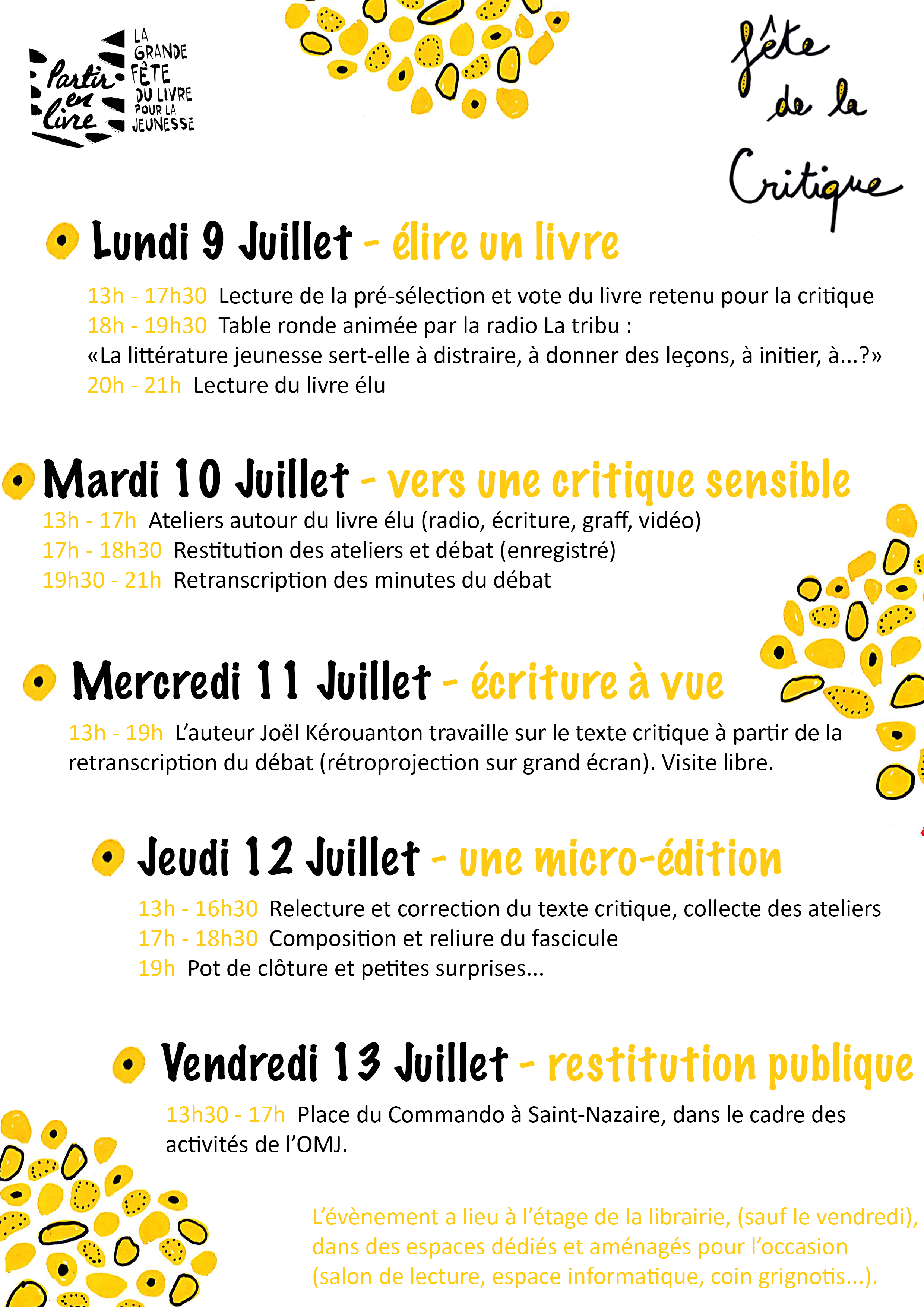 ☛ À noter, un temps public Lundi 9 Juillet à 18h : Table ronde animée par la radio La Tribu : "La littérature jeunesse sert-t-elle à distraire, à donner des leçons, à initier, à...?"