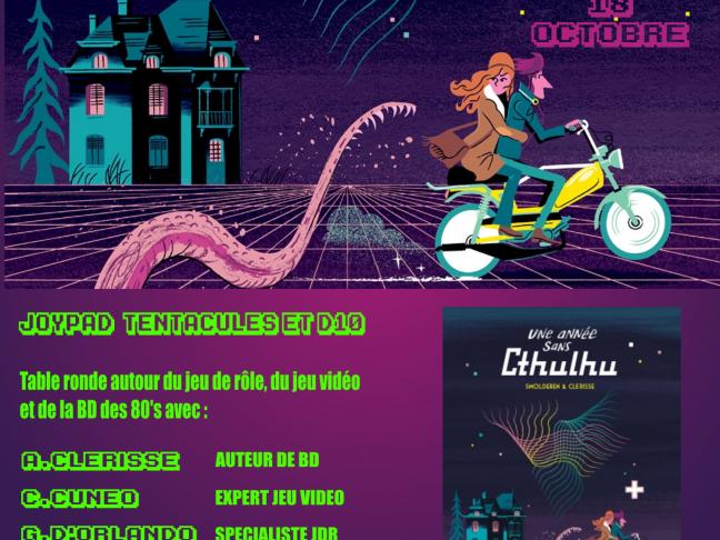 Vendredi 18 Octobre, Alexandre Clérisse viendra présenter « Une année sans Cthulhu » toujours accompagné au scénario par T.Smolderen aux éditions Dargaud. Après la SF (Souvenirs de l'Empire de l'Atome) et l'espionnage (L'été diabolik), les auteurs s'emparent du jeu de rôle et du vidéo des années 80 tout en s'inspirant des œuvres de Lovecraft.