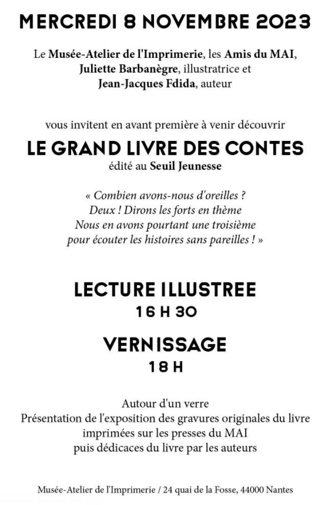 En présence de l'illustratrice Juliette Barbanègre et de l'auteur Jean-Jacques Fdida, venez découvrir en avant première le GRAND LIVRE DES CONTES. à 16 h 30, Ils vous conterons Combien avez-vous d'oreilles ? Deux.....