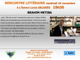 Rencontre littéraire Brahim Métiba 24/11/2017 Après "Ma mère et moi" unanimement salué par la critique, Brahim Metiba écrit un deuxième texte tout aussi intense : le livre… Lire la suite Type d'événement Lecture publique
