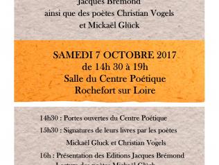 L'Automne poétique de Rochefort sur Loire 07/10/2017 Portes ouvertes du Centre Poétique Présentation des Editions Jacques Brémond Lecture par les poètes Mickaël Glück et… Lire la suite Type d'événement Lecture publique