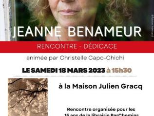 rencontre avec Jeanne Benameur 18/03/2023 Jeanne Benameur est l'invitée exceptionnelle pour fêter les 15 ans de la librairie ParChemins. Rencontre discussion animée… Lire la suite Type d'événement Lecture publique