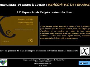Rencontre littéraire "Femme et esclave" 14/03/2018 Soirée littéraire 'femme et esclave' en présence de Clara DOminingues traductrice et Oristelle Bonis des éditions iXe Sonia… Lire la suite Type d'événement Lecture-spectacle