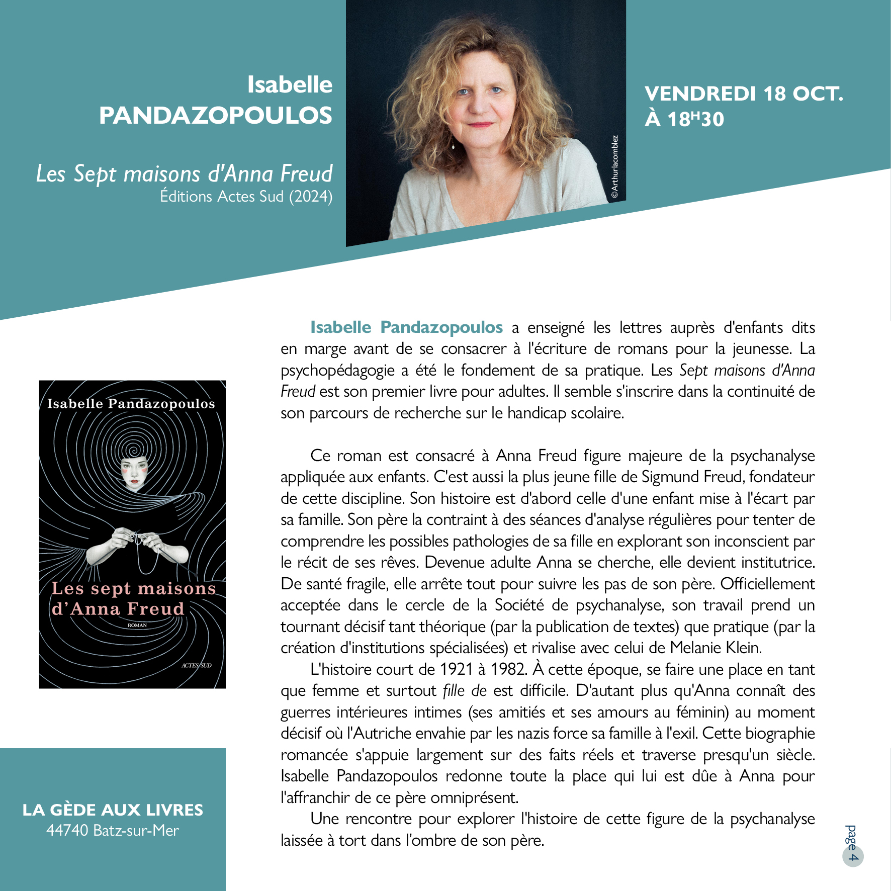 Rencontre avec Isabelle Pandazopoulos, autrice du roman Les Sept maisons d'Anna Freud (éditions Actes Sud 2024).
