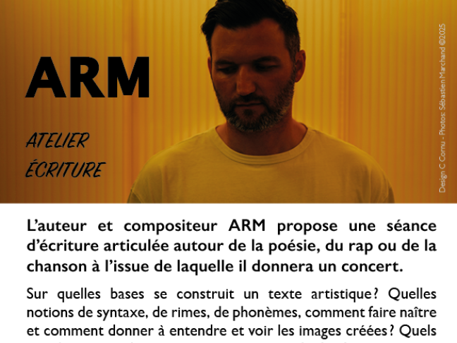 Le musicien auteur-compositeur ARM propose une séance d’écriture articulée autour de la poésie, du rap ou de la chanson.