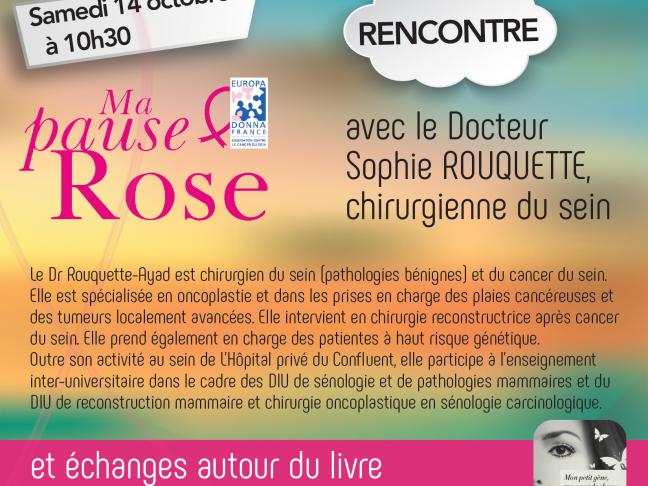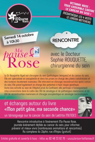 Dans le cadre d’Octobre Rose la Médiathèque Les Quatre Vents du Loroux Bottereau reçoit le Docteur Sophie Rouquette, chirurgienne du sein, lors d’une rencontre autour du livre « Mon petit gêne, ma seconde chance » de Laetitia Mendès mais aussi de toute la littérature liée au cancer du sein.