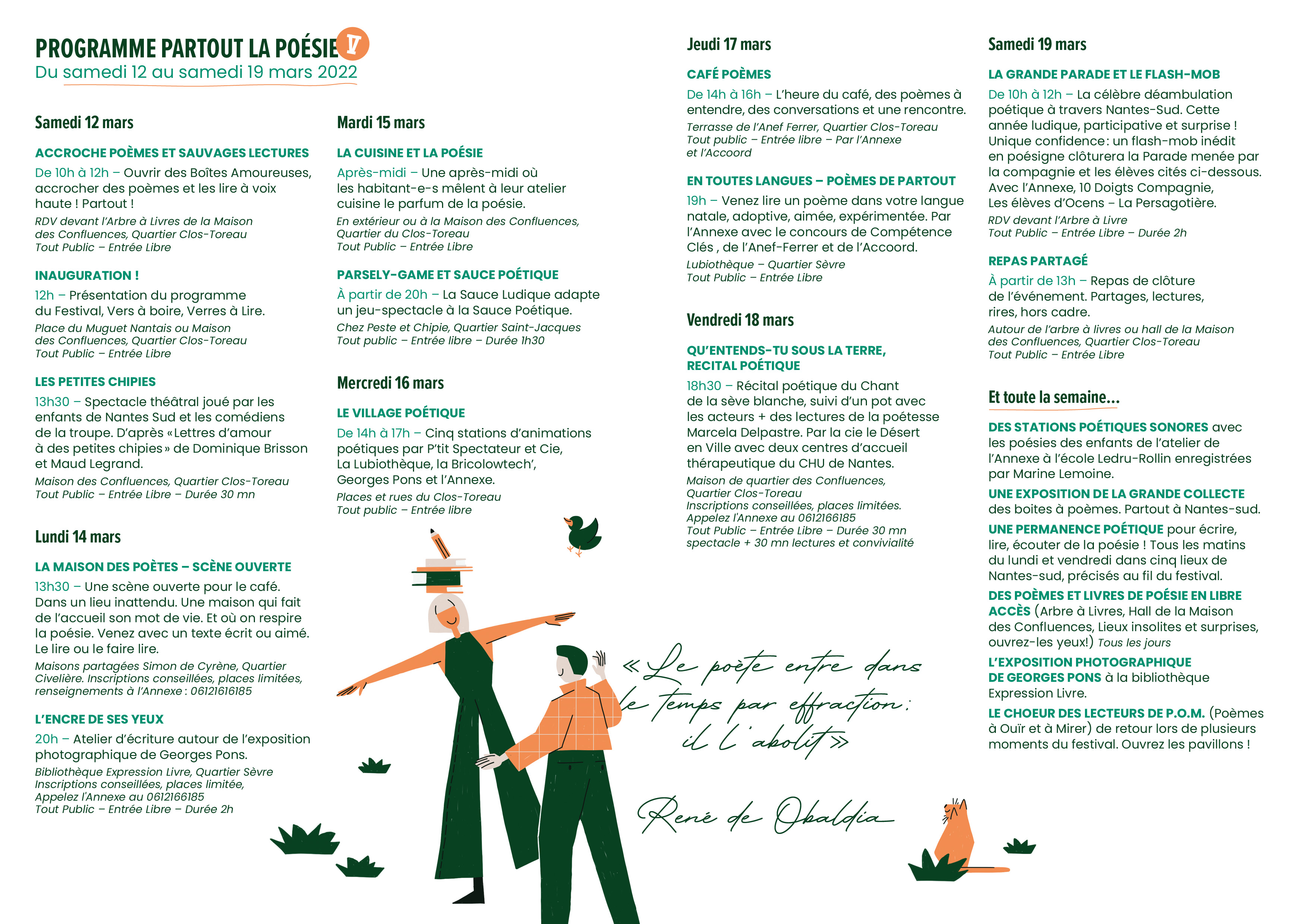 Partout, habitantes et habitants, passants et visiteurs, associations et autres acteurs d’ici, expérimentent leur poésie, s’ouvrent à celles des autres, et font naître ensemble un « souffle poétique » espiègle, généreux. Cette année, le souffle s’accroît avec les résidents des lieux d’accueil de soins, sociaux et éducatifs, qui s’ouvrent à leur tour et partent à la rencontre, pour (re)nouer les fils qu’entre nous, la poésie tisse.