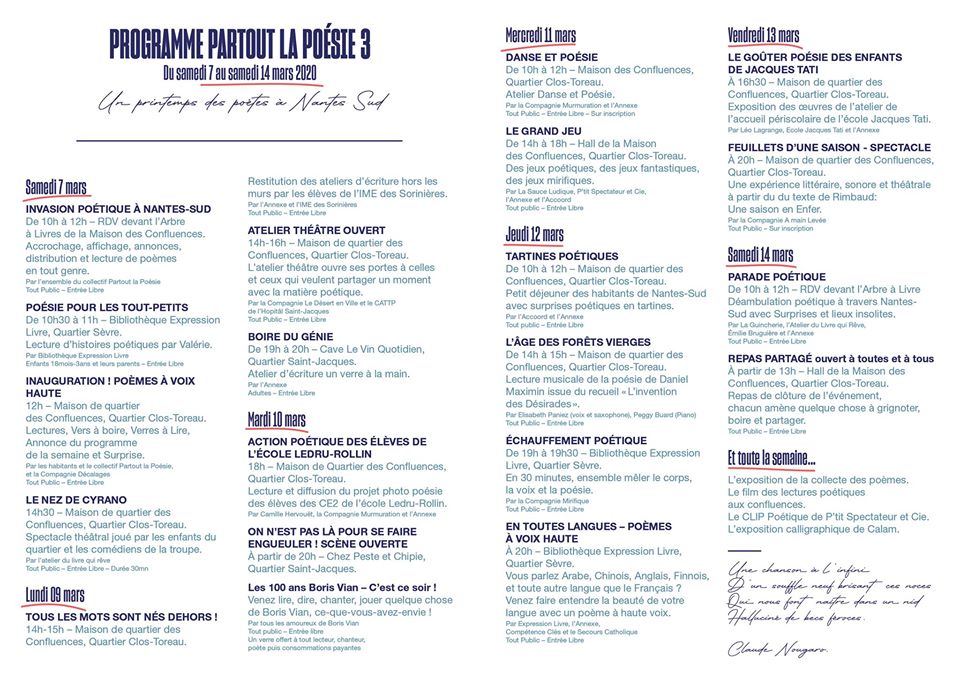 Partout la Poésie est un événement proposé par le collectif Partout la Poésie composé des associations, acteurs municipaux, artistes, habitants du grand quartier Nantes-Sud.