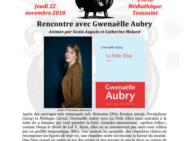 Pour le Troisième Bouillon de la saison, nous accueillerons Gwenaëlle Aubry le jeudi 22 novembre à 19h30 pour son roman La folie Elisa paru aux éditions Mercure de France. En partenariat avec les bibliothèques d'Angers, cette rencontre aura lieu à la Médiathèque Toussaint.