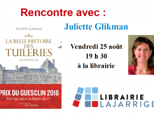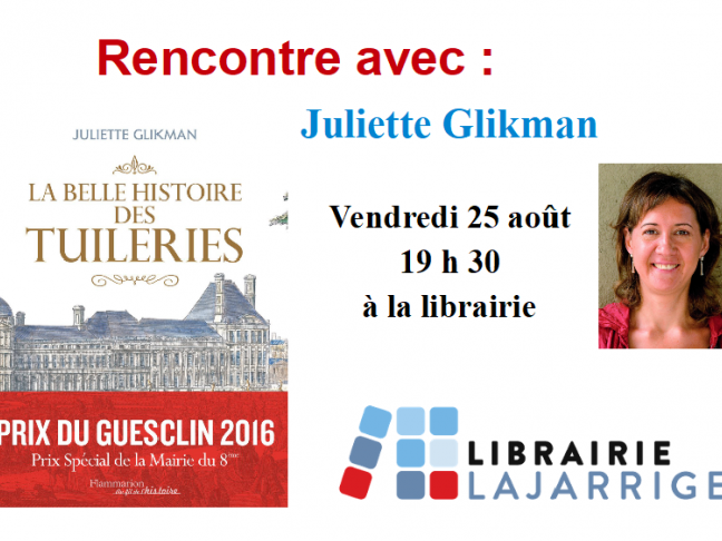 Avis aux férus d'Histoire ou simplement à tous les curieux, venez vous émerveiller avec la passionnée et très enjouée Juliette Glikman qui nous fera le plaisir de venir nous conter : " La belle histoire des Tuileries", prix du Guesclin (Prix spécial de la mairie du 8ème arrondissement) le vendredi 25 août à 19h30 à la librairie.