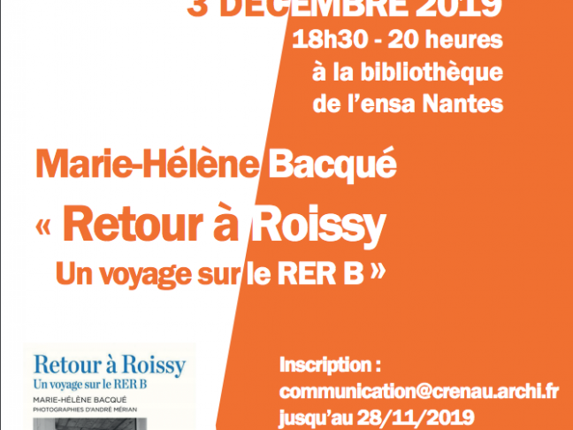 "Le laboratoire de recherche AAU-CRENAU et la bibliothèque de l'ensa Nantes ont le plaisir de vous inviter à la première rencontre auteur-chercheur consacrée à Marie-Hélène Bacqué pour son ouvrage "RETOUR À ROISSY"